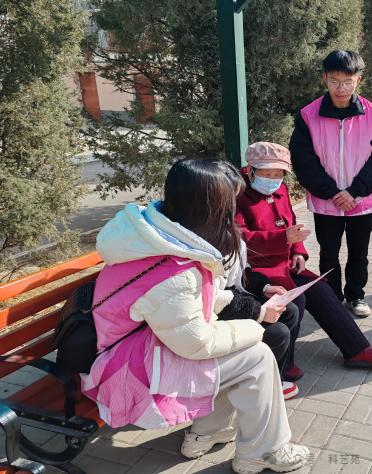 志愿者在社区开展关心老人科普教育活动,在活动中二十余名志愿者同社区民警一起对在社区锻炼的老人进行了防诈骗宣传。