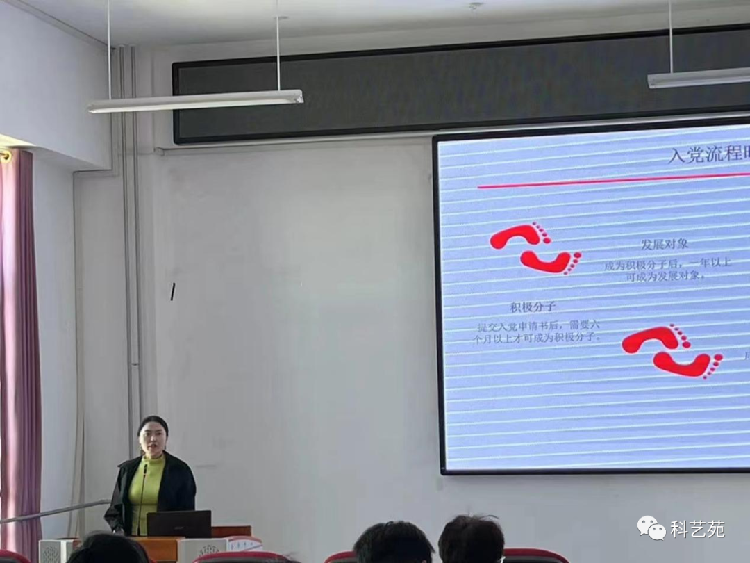 在培训课上,张茜老师讲授了有关于发展党员工作实施细则的主要内容。讲述了十个小点,包括党组织派人谈话、会在一个月内有谈话、推荐和确定入党积极分子、上层党委备案、指定培养联系人、培养教育考察,确定发展对象、报上级党委备案、进行政治审查、开展集中培训等流程。