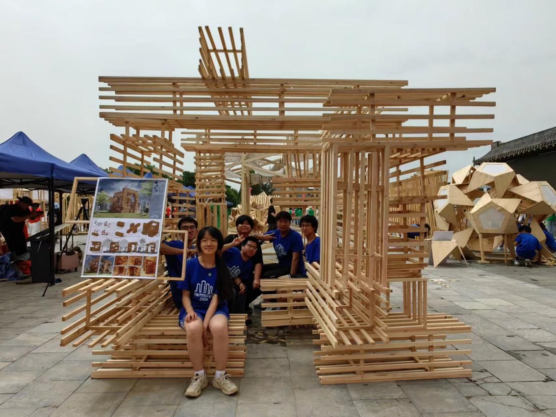建筑学专业23级学生陈雨萱、李明阳、马文骏、段鑫昱、周阳、陈阳在魏融老师和周碧瑶老师的指导下,经过3个多月的赛前准备和两天的现场搭建,设计的作品《椽承古今》获得了2024年辽宁省第五届大学生搭建设计竞赛三等奖。
