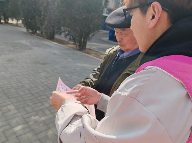志愿者在社区开展关心老人科普教育活动,在活动中二十余名志愿者同社区民警一起对在社区锻炼的老人进行了防诈骗宣传。