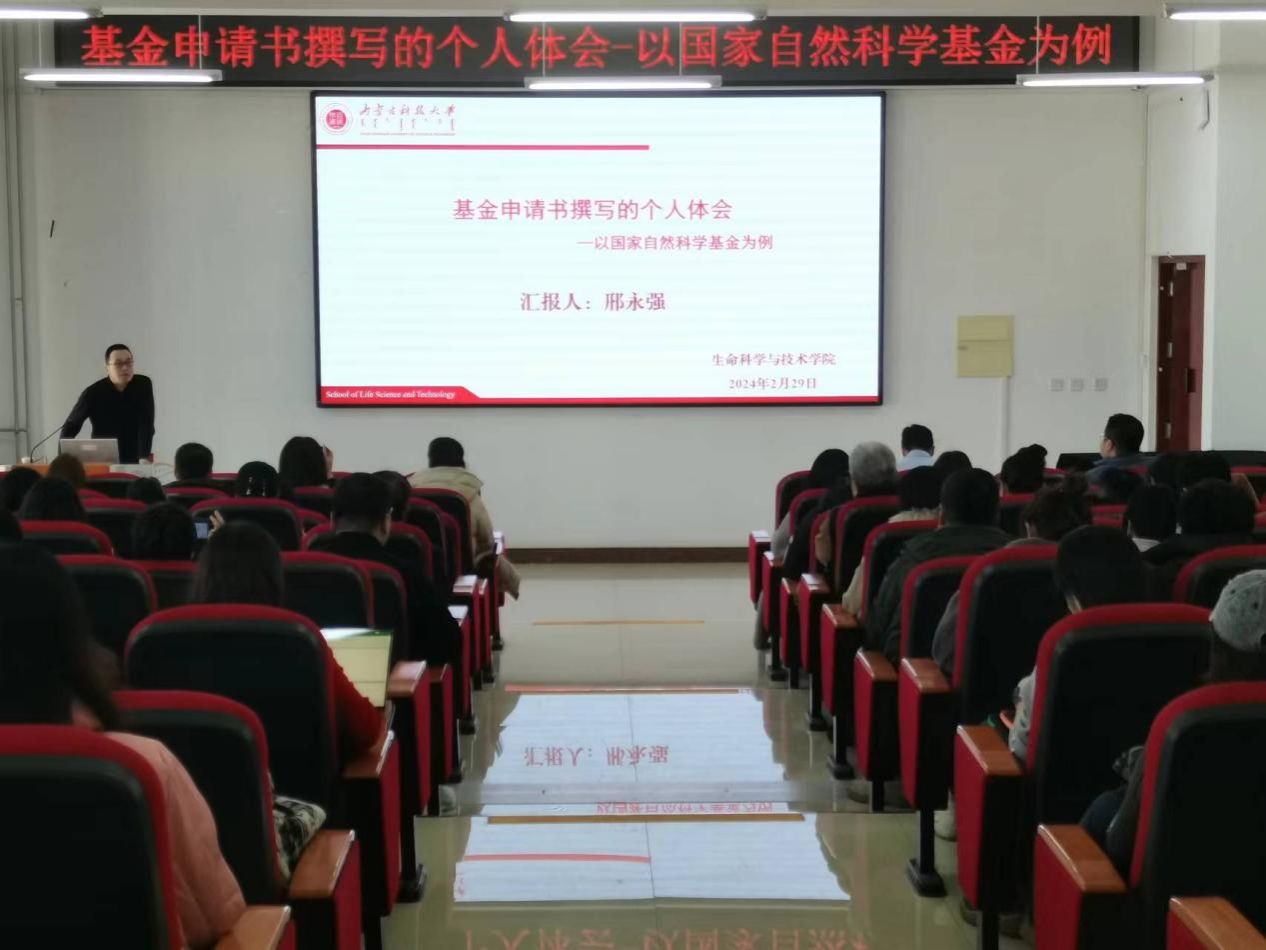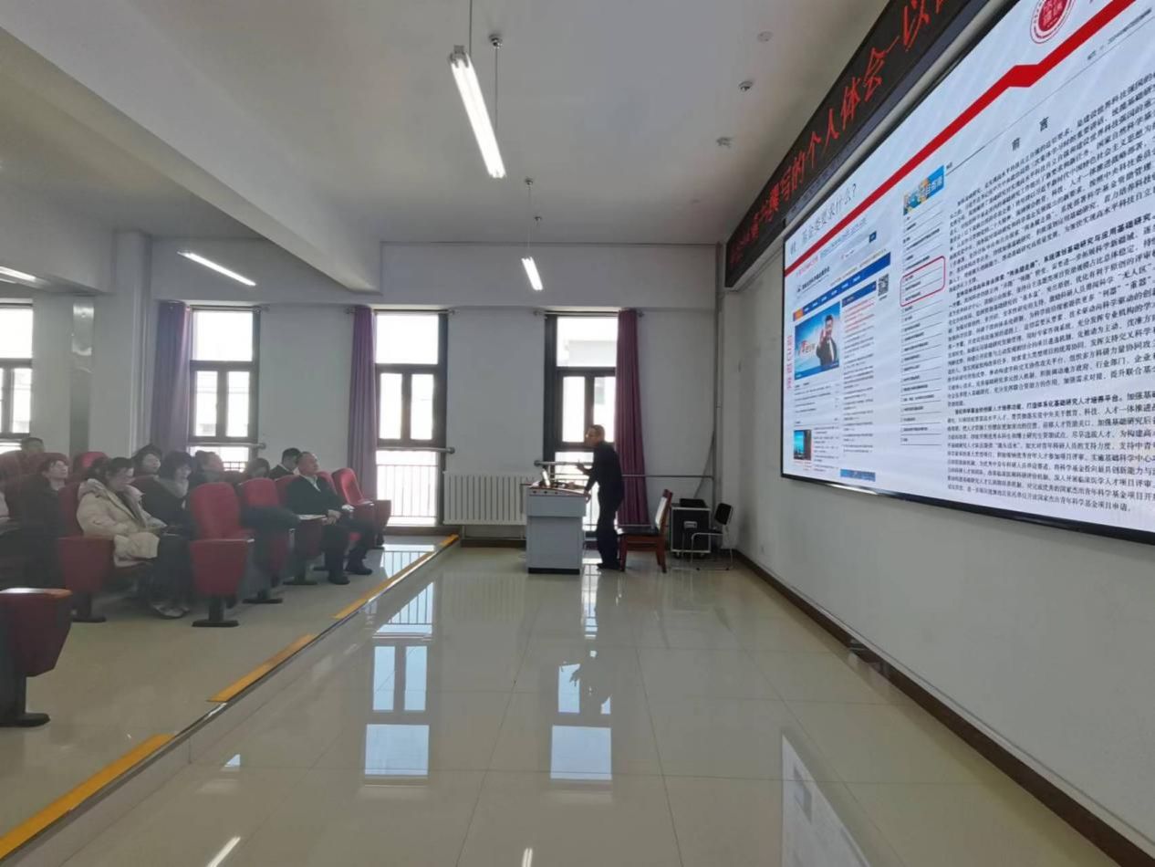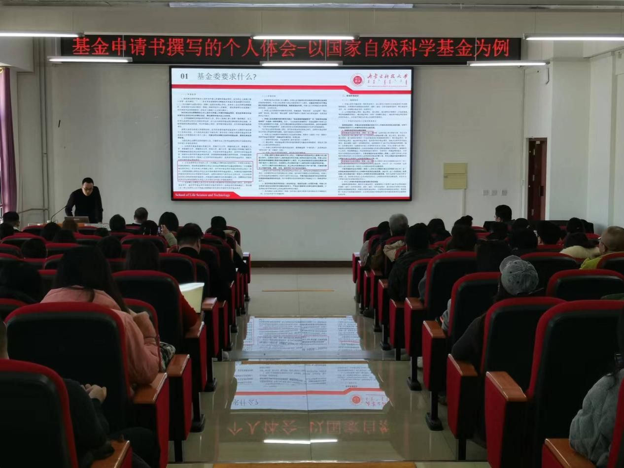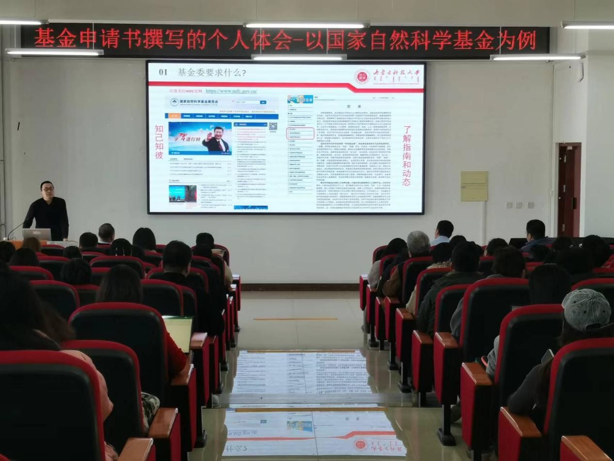 全体教职工在明德楼A401开展关于基金申请书撰写的个人体会-以国家自然科学基金为例的会议,特邀邢永强教授进行汇报。