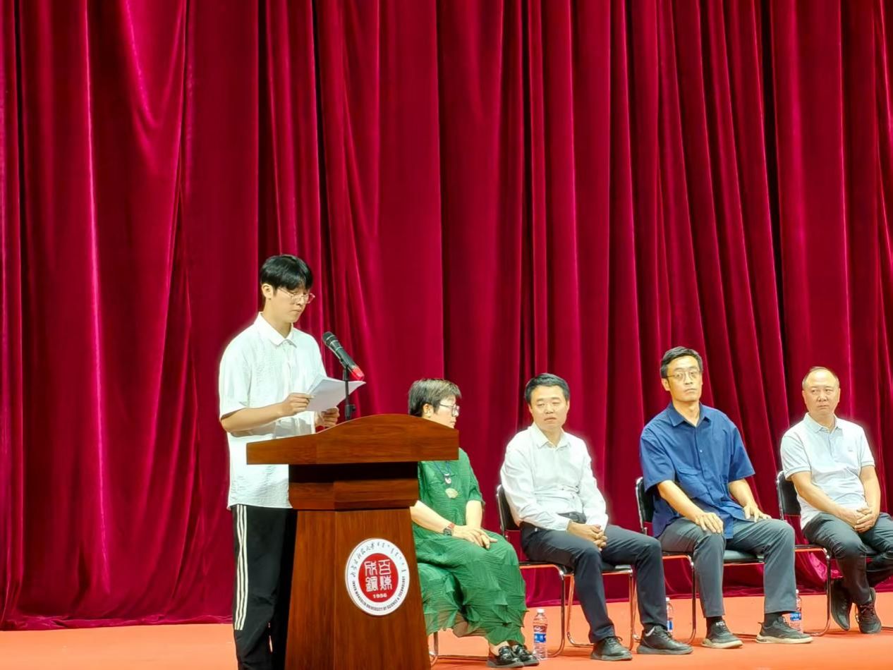 随后,优秀教师代表魏光普老师发言。他结合自身教学经验,从学习方法、实践能力等方面入手,鼓励新生主动探索、积极实践。