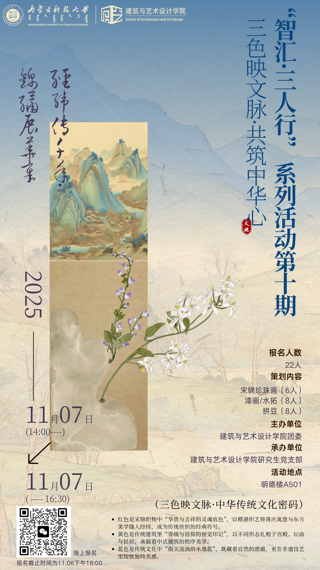 成人直播 团委与研究生党支部将于11月7日(14:00--16:30)在明德楼A501举办“智汇·三人行”系列活动第十期——“三色映文脉·共筑中华心”,内容涵盖宋锦珍珠画、漆画/水拓及拼豆三类传统文化体验,线上报名截止时间为11月6日18:00,欢迎同学们积极参与。