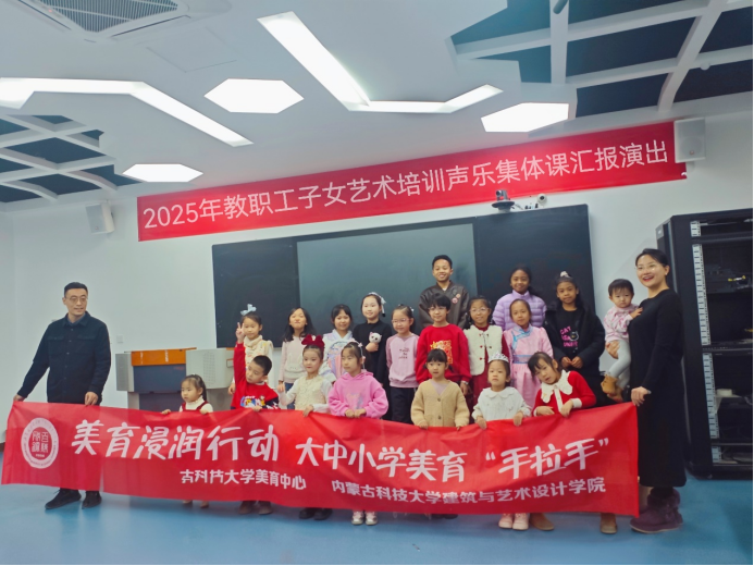 及美育名师工作室联合举办的“童声咏华章 艺韵润科大——2025年教职工子女艺术培训声乐集体课汇报演出”在明德楼H501教室悠扬启幕。20余名小学员身着节日盛装,以清澈童声接力演唱《稻香》、《听我说谢谢你》、《金色童年》等动人旋律。为现场观众献上了一场精彩纷呈的视听盛宴,更为寒冷的冬日注入融融暖意。