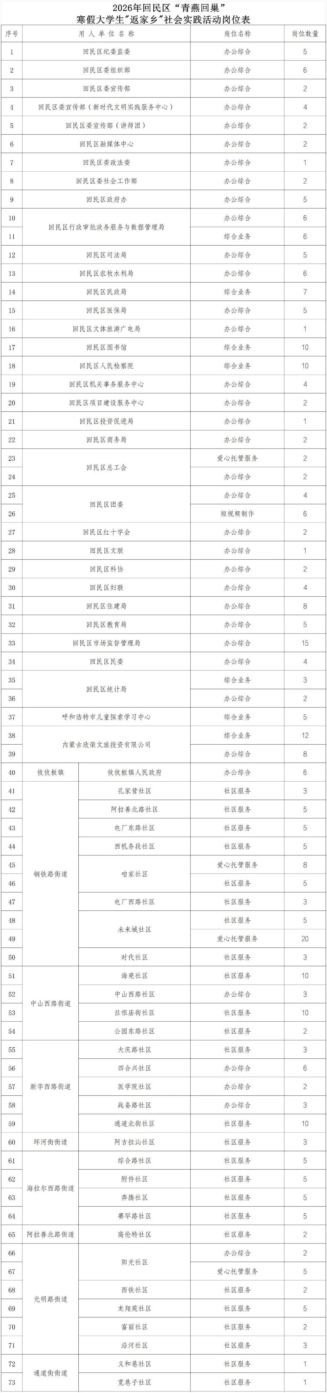 请已在“创青春”上报名的大学生点击下方蓝色字体下载《回民区“青燕回巢”社会实践报名表》,并于2026年1月5日前将电子版发送至回民区团委邮箱:[email protected](邮件标题为回民区“青燕回巢”社会实践申请+姓名”命名)。