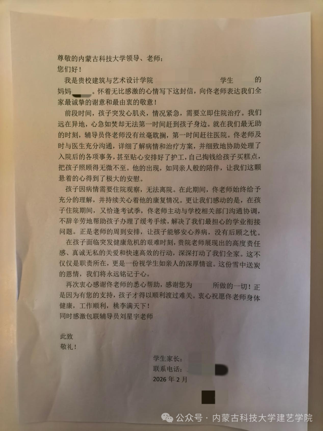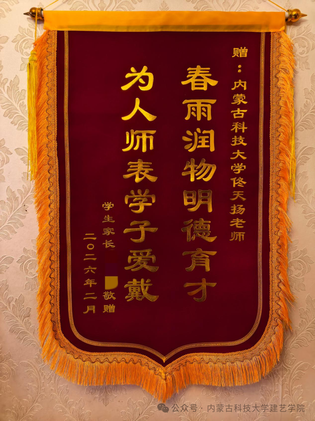 收到了学生家长的一面锦旗和一封感谢信,对班主任佟天扬老师及学院学工办、教学办等各部门的老师在上学期对患病学生的悉心照料与无私帮助表达了由衷的感谢和莫大的肯定。